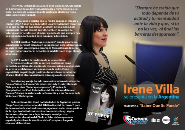 Villa, lejos de resignarse ante tan dura adversidad, planteó su vida en un marco constante de superación y motivación. Se recibió de Licenciada en Periodismo en la Universidad Europea de Madrid y tiene, entre otras formaciones, estudios en Psicología, Humanidades y Comunicación Audiovisual. Su experiencia de vida fue plasmada en un libro titulado "Saber que se puede", nombre que tendrá la Conferencia de Liderazgo y Motivación que brindará este miércoles. Además, publicó los libros "Saber que se puede, veinte años después", y "Nunca es demasiado tarde, princesa".